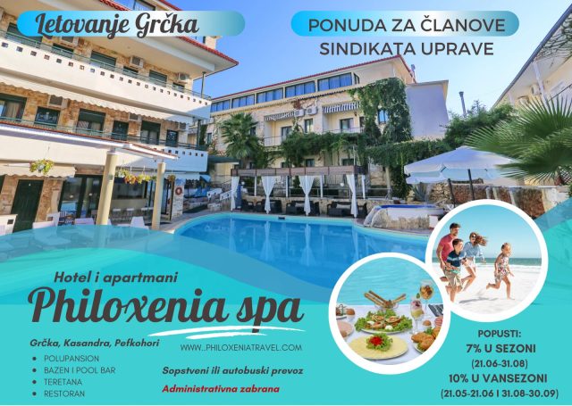 Синдикат управе Србије, у сарадњи са агенцијом Путник и власником Philoxenia хотела, омогућио је попусте и плаћање на рате члановима Синдиката. Гостопримство из прве руке за наше чланове у Philoxenia хотелу, студијима и апартманима у Пефкохорију (Грчка), Хотелски смештај са полупансионом, (доручак и вечера шведски сто), коришћење базена са ђакузијем, теретане, клима, wifi у цени аранжмана. Најам породичних студија са базеном...