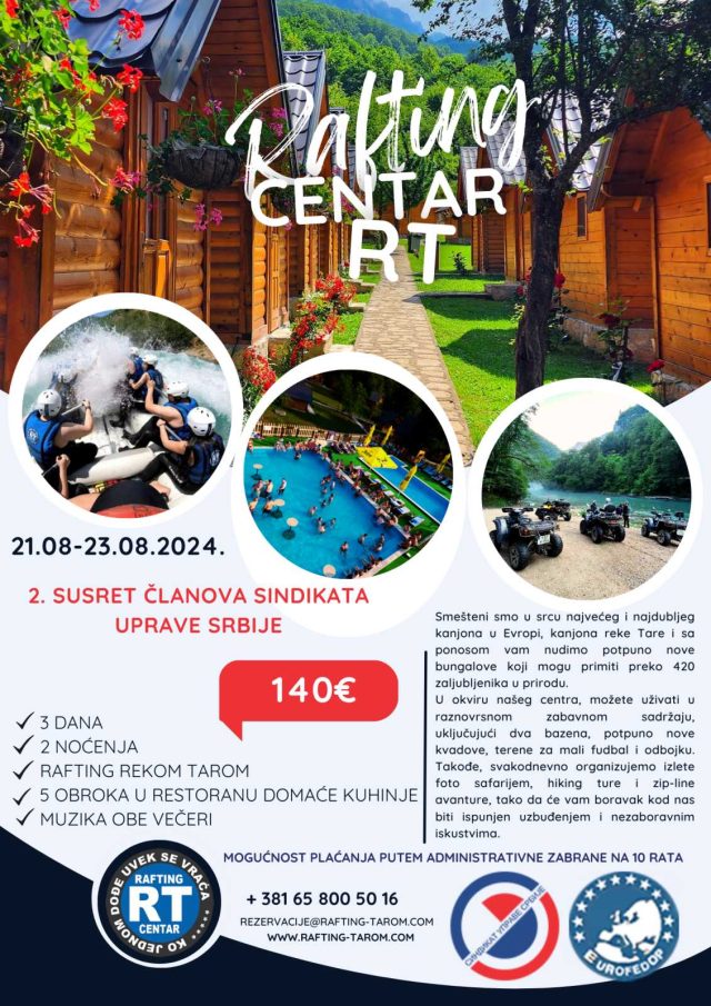 Синдикат управе Србије позива своје чланове на 4. по реду сусрете у периоду од 19. до 21. августа 2026. године.Тродневни аранжман по цени од 140 евра по особи обухвата:- 2 ноћења у бунгаловима са купатилом- рафтинг реком Таром- 5 оброка- музика обе вечериМогућност плаћања у 12 рата, а све додатне информације добићете на контакт телефон: 065/3230020.